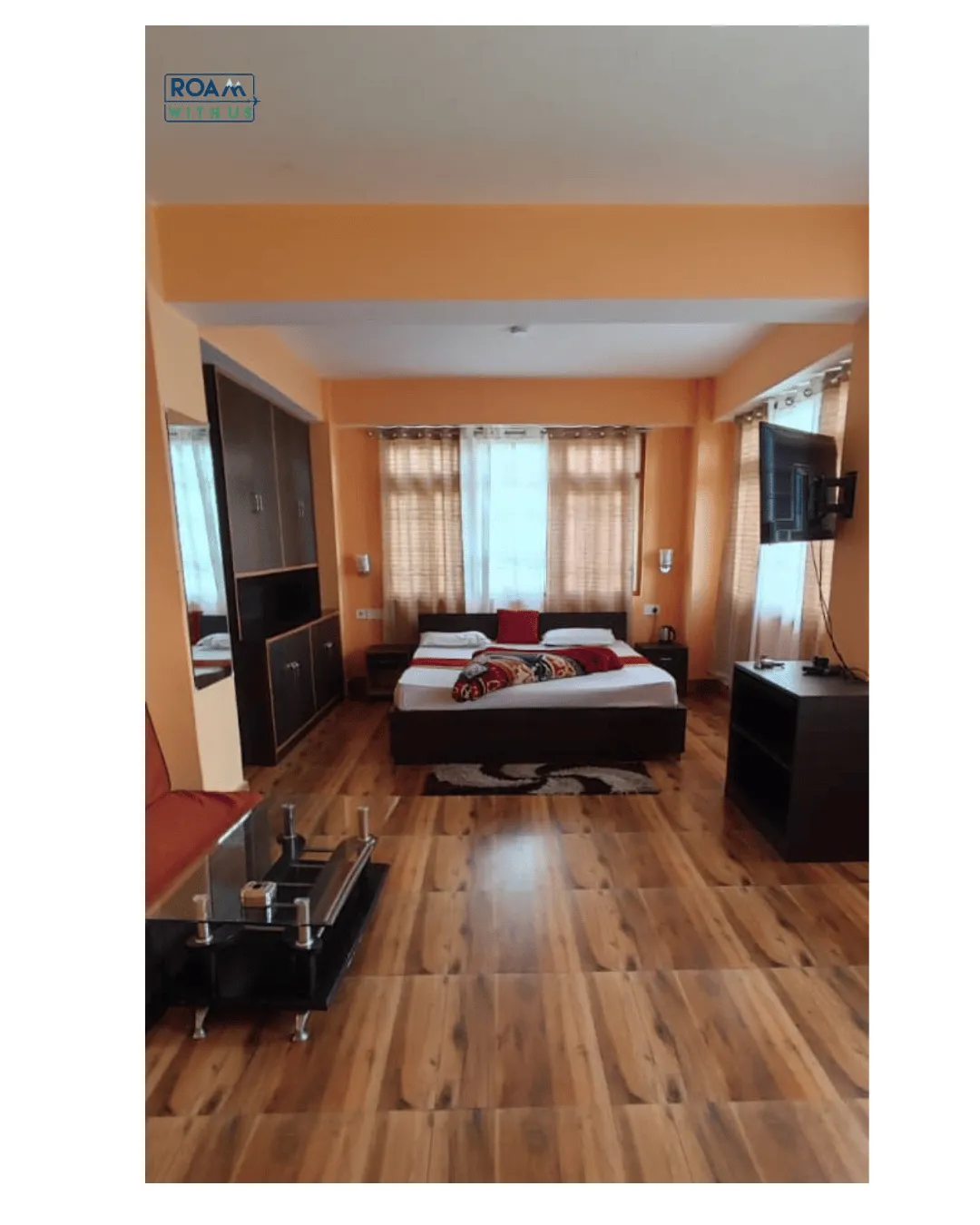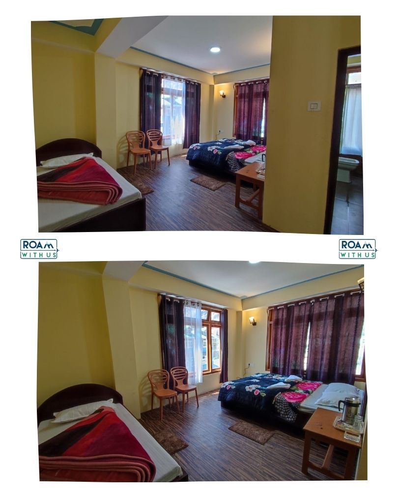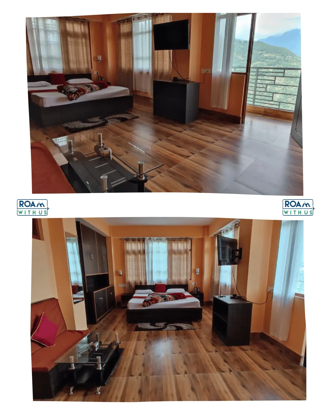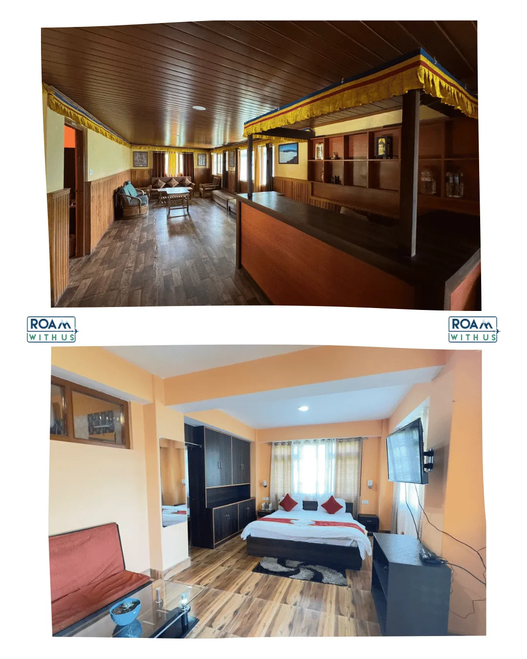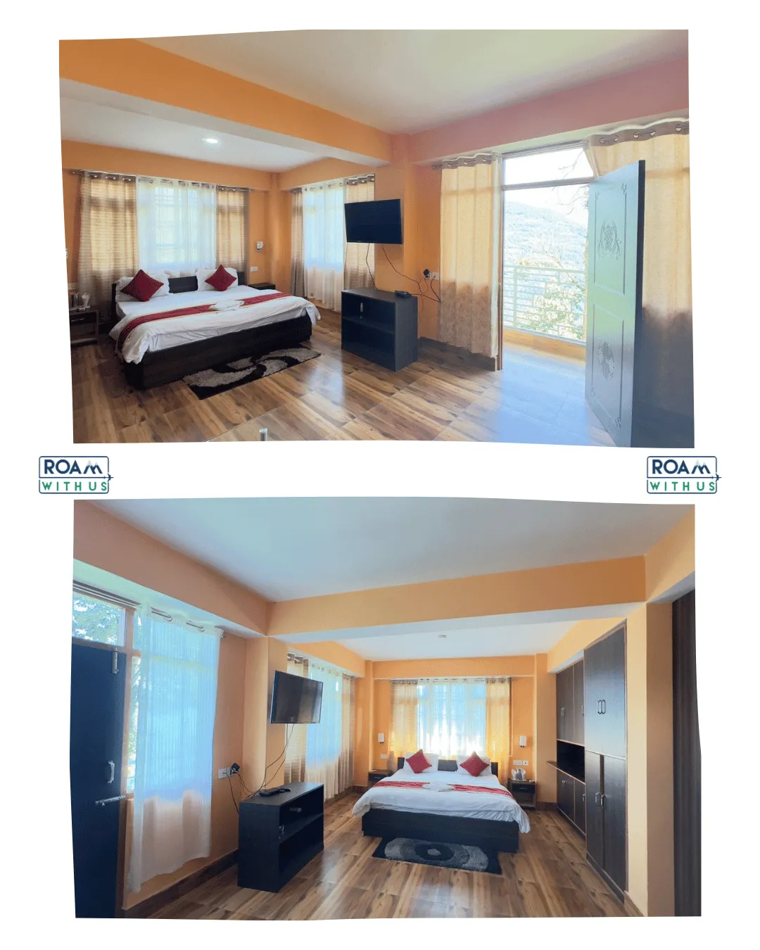 Our mountain-view rooms, plush bedding, and attached bathrooms with 24/7 geyser facilities—essential for the crisp Lachung air.
